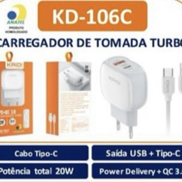CARREGADOR DE TOMADA TURBO USB + Tipo-C KD106TC