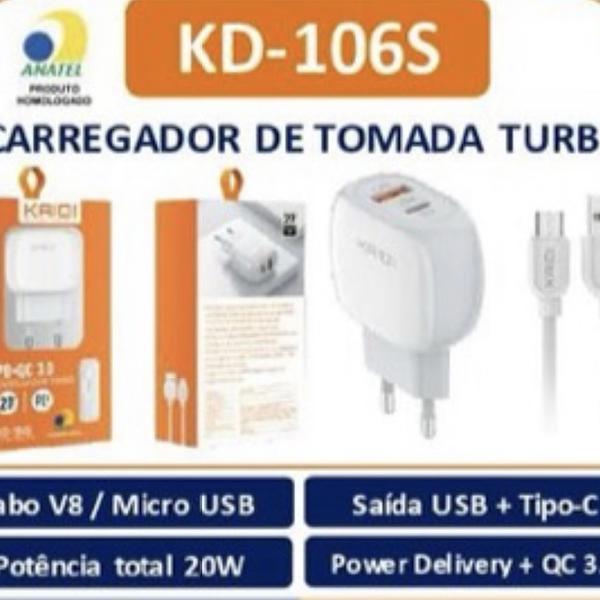 CARREGADOR DE TOMADA TURBO USB + Tipo-C KD106V8