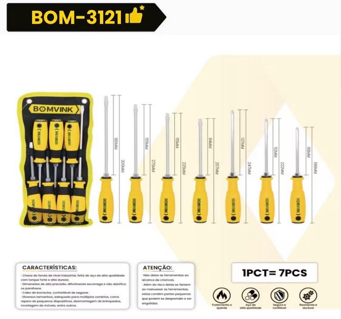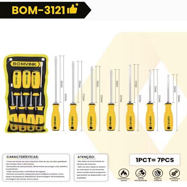 CONJUNTO DE 7 CHAVES DE FENDA E PHILLIPS COM CABO DEIMPACTO E FUNÇÃO DE MARTELO BOM3121