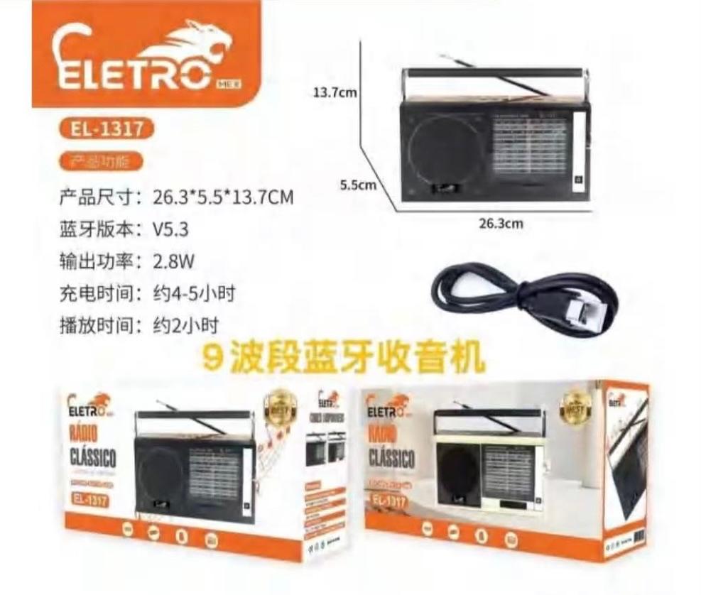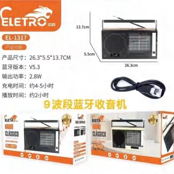 Rádio Clássico FM AM 1. Versão Bluetooth: 5.3 • 2. Potência de saída: 2.8W 3. Tempo de carregamento: 4 à 5 horas 4. Tempo de reprodução: 2 horasEL1317