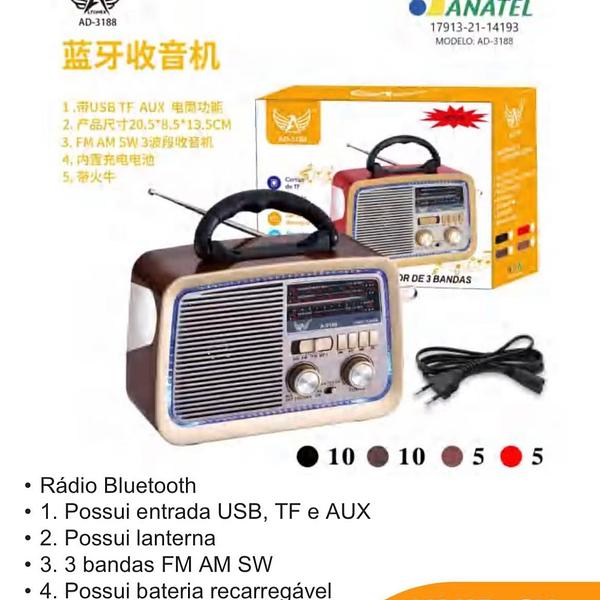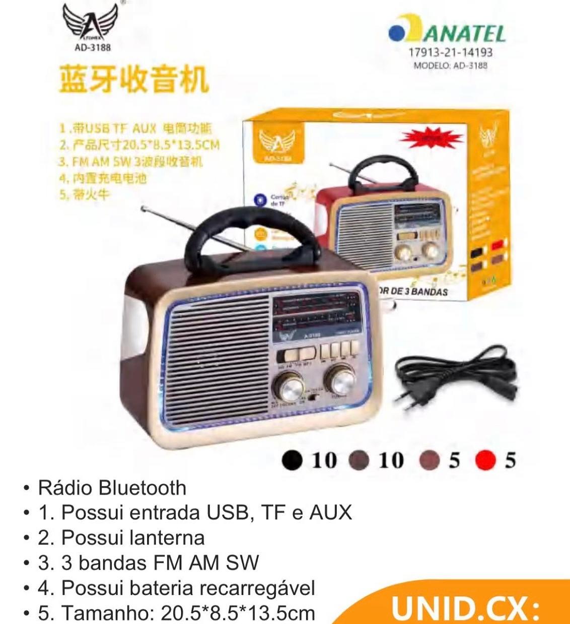 Rádio FM AM com bluetooth cartão memória USB AD3188