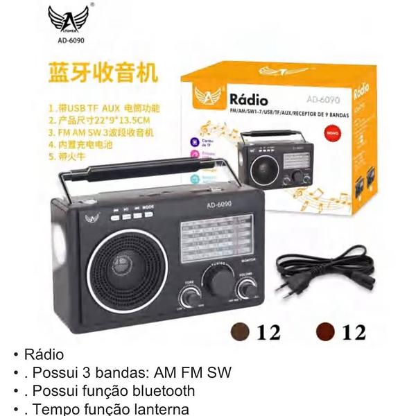 Rádio . Possui 3 bandas: AM FM SW Possui função bluetooth • Tempo função lanterna FM AM AD6090